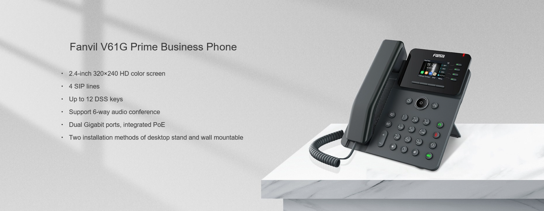 Fanvil V61G IP Telefon Seti, şık ve kullanıcı dostu bir iş IP telefonudur. 2,4 inç (320x240) yüksek çözünürlüklü renkli ekrana sahiptir, 4 SIP hattını destekler ve 6 kişilik sesli konferans görüşmesine olanak tanır. HD ses, çift Gigabit portu gibi zengin özellikleriyle Fanvil V61G ip Telefon, çeşitli iş uygulaması senaryoları için uygundur ve kullanıcılara mükemmel bir etkileşimli deneyim ve rahat anlık iletişim hizmetleri sunar.