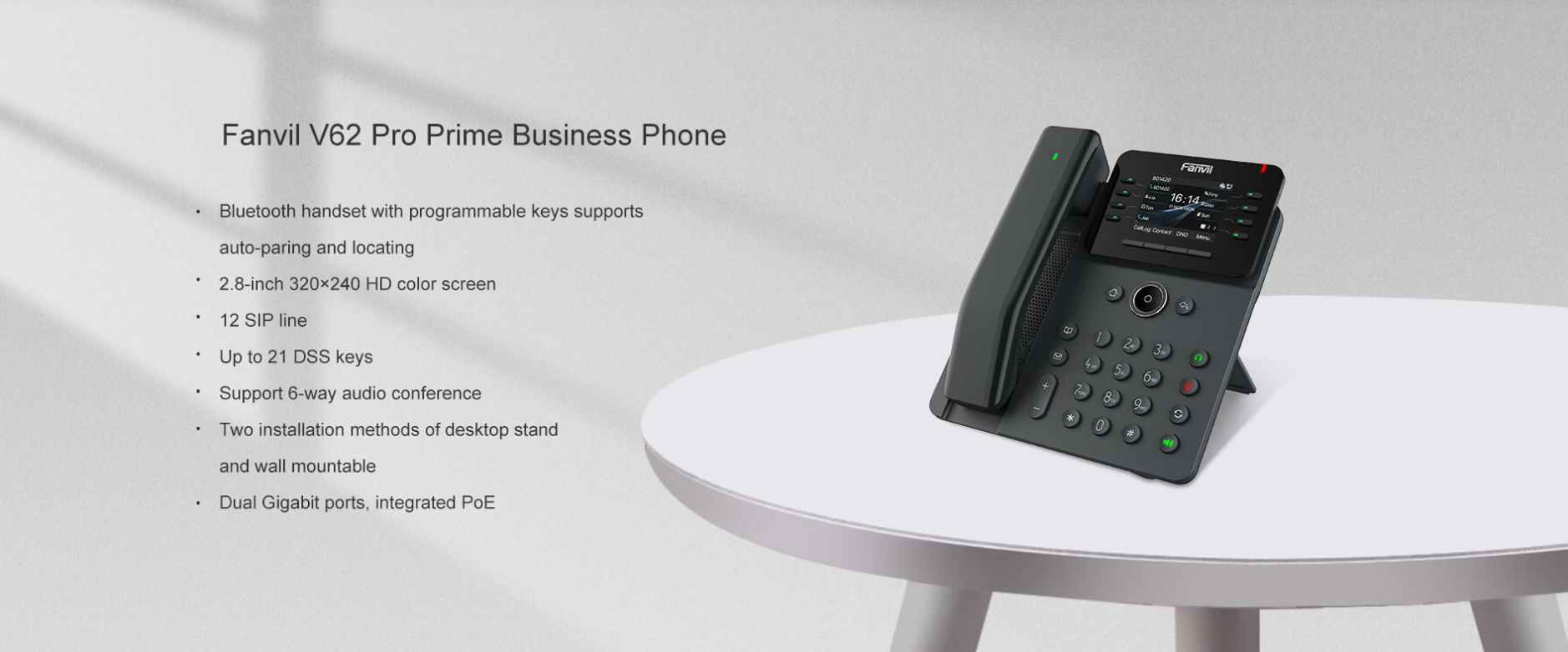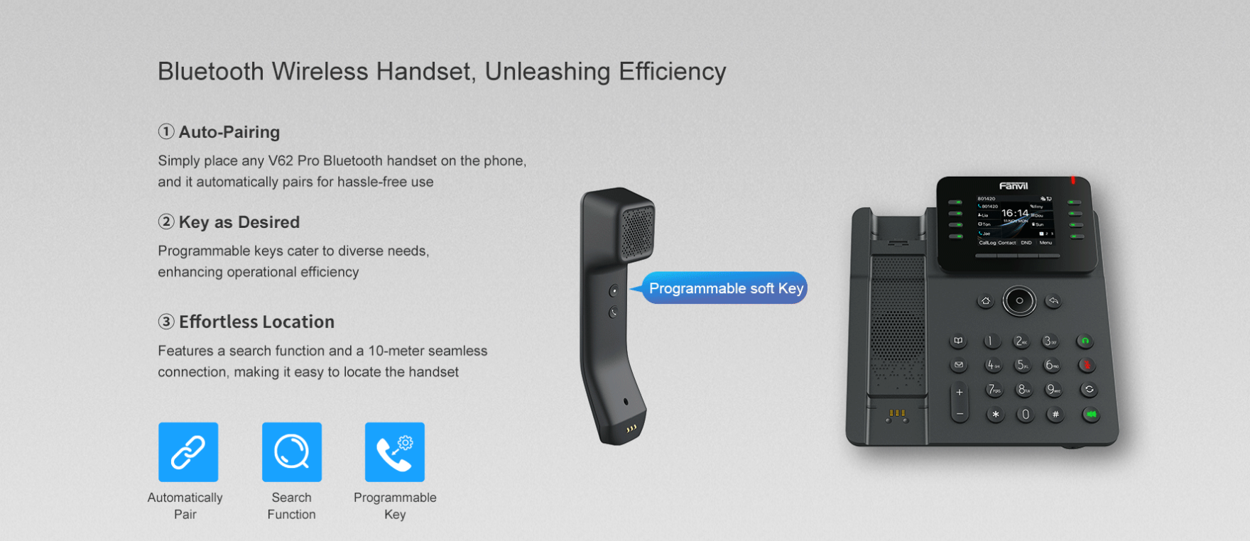 Fanvil V62 Pro IP Telefon Seti, gelişmiş iş verimliliği için programlanabilir tuşlara sahip, HD renkli ekranlı ve zenginleştirilmiş Bluetooth ahizesi bulunan, iş için vazgeçilmez bir IP telefondur. Bluetooth ahizeler, tüm V serisi Pro modellerinde değiştirilebilir ve kaybolması durumunda kolayca bulunabilir, böylece ofis çalışmalarında üstün kolaylık ve işlevsellik sağlar. 12 SIP hattı, 6 yönlü konferans görüşmesi ve çift Gigabit portu ile Fanvil V62 Pro IP Telefon, modern iş profesyonellerine özel olarak tasarlanmış yüksek performanslı bir iletişim deneyimi sunar.