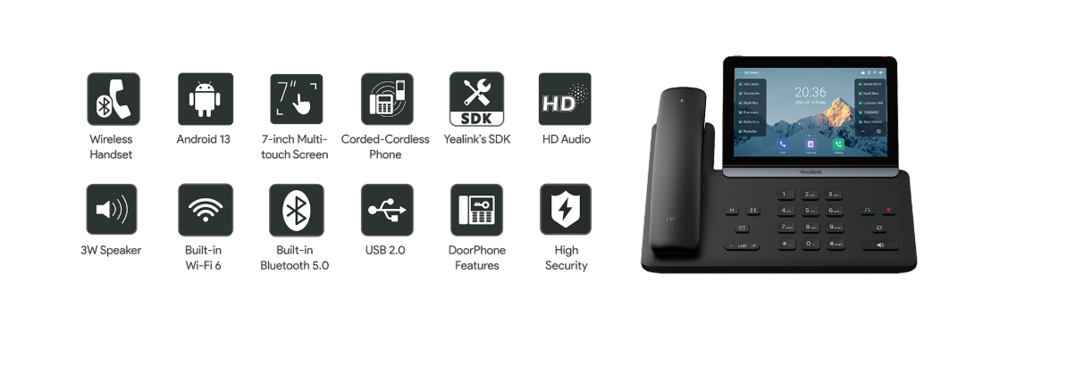 Yealink SIP-T88W Pro, iş profesyonelleri için zenginleştirilmiş HD sesli arama deneyimi sunan, kullanımı kolay akıllı bir iş telefonudur. Bu akıllı iş telefonu, standart bir telefonun kolaylığıyla verimliliği artıran iletişimi mümkün kılar. Yealink Bluetooth ahizesi BTH88 ile kullanıcılar, görüşme sırasında özgürce hareket edebilirler – masalarından ayrıldıklarında artık cevapsız çağrı kalmaz. 10 metreye (30 feet) kadar menziliyle Yealink Bluetooth ahizesi, kullanıcılara daha fazla ofis esnekliği sunar. Android 13 işletim sistemine dayanan SIP-T88W Pro, daha özlü ve iş odaklı yeni bir kullanıcı arayüzü benimseyerek kullanıcıların iş verimliliğini büyük ölçüde artırır.